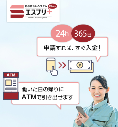 セブン銀行と連携することで、給与前払いが24時間365日いつでも可能で、申請後即時に口座へ振り込まれる画期的なシステムです。