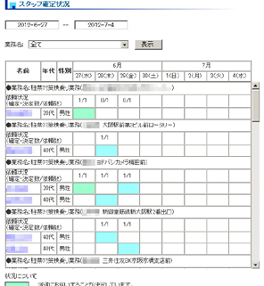 それぞれの依頼に対して、 確定数と依頼数、確定したスタッフ名、年齢・性別が閲覧できます。
